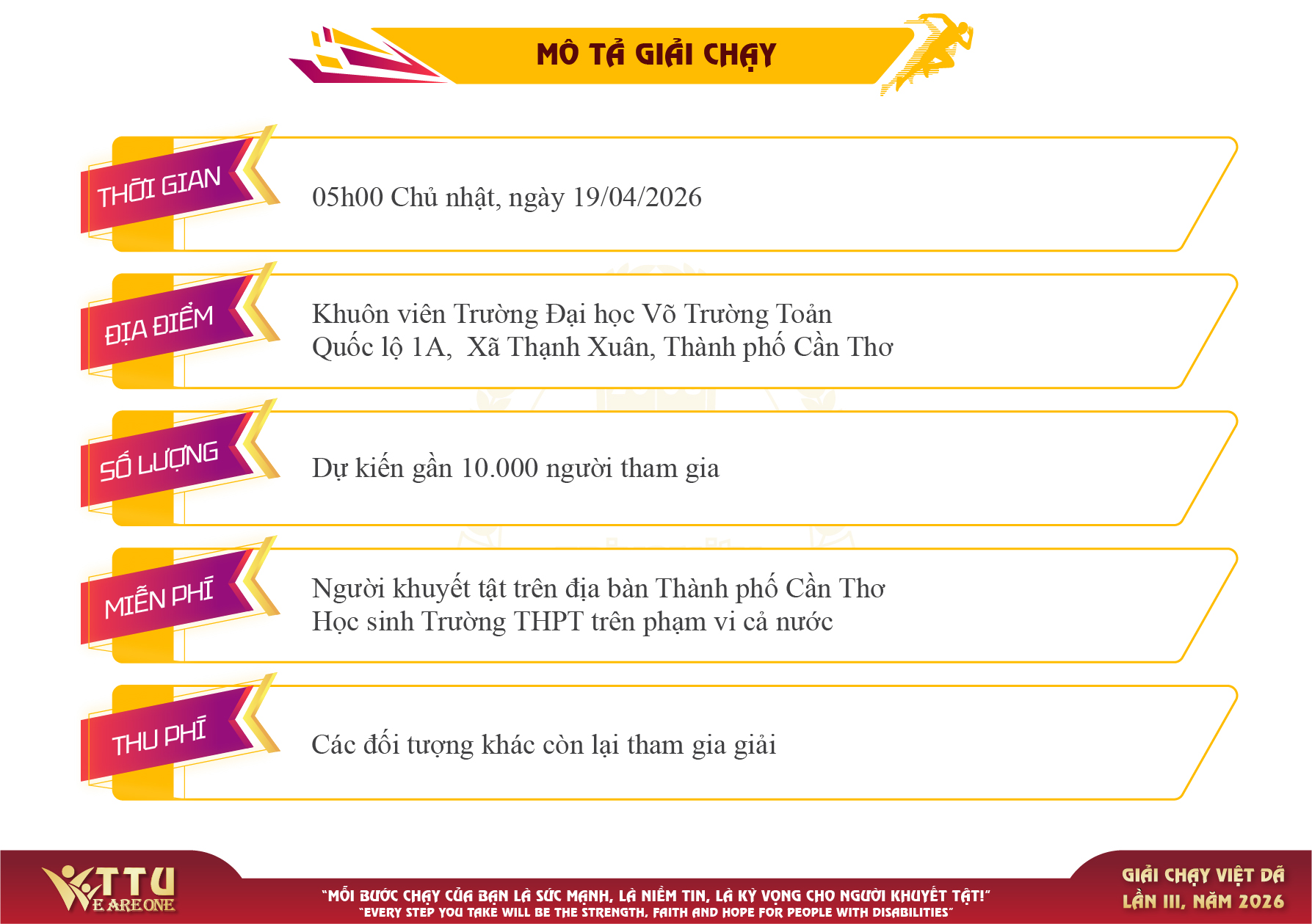+ Người khuyết tật trên địa bàn thành phố Cần Thơ, học sinh trung học phổ thông (lớp 10, 11, 12)trên phạm vi cả nước (miễn phí đăng ký tham dự, được nhận 01 áo, 01 BIB tham gia chương trình, 01 nước suối và 01 hộp sữa tiếp sức trong ngày diễn ra giải, sau khi hoàn thành đường chạy sẽ được nhận 01 huy chương và đồng thời nhận được 01 vé tham gia vui chơi miễn phí các trò chơi tại Công viên giải trí Ti & Ni với trị giá tương đương 250.000đồng/vé trong ngày diễn ra chương trình).